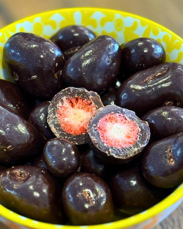 Freeze Dried Strawberries coated in premium Dark Chocolate. Crisp freeze-dried strawberries coated in dark chocolate - tangy, sweet and rich.